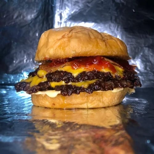 Doble medallon de 110gr - 4 fetas de de cheddar - 1 medida de bacon - Cebolla caramelizada - Barbacoa - Pan de queso