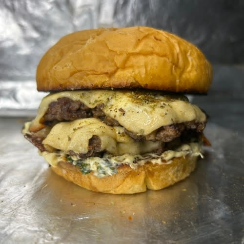 Doble medallon de 110gr - 4 fetas de de dambo - Provoleta - Mayopesto - Mix hierbas - Pan de papa