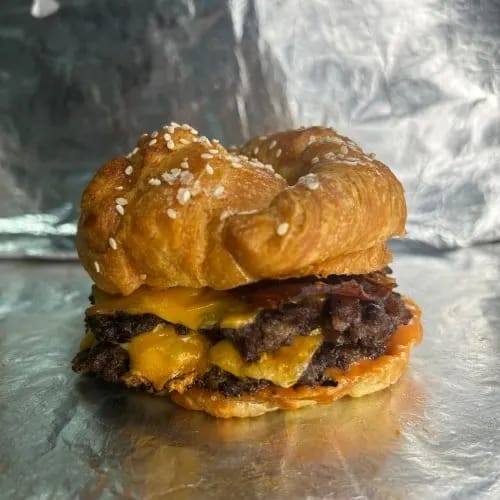 Doble medallon de 110gr - 4 fetas de de cheddar - 1 medida de bacon - Mayonesa - Ketchup - Mostaza - Pan de medialuna