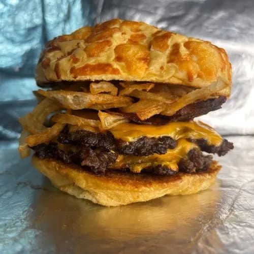 Doble medallon de 110gr - 4 fetas de de cheddar - 1 medida de bacon - Cebolla crispy - Pan de queso